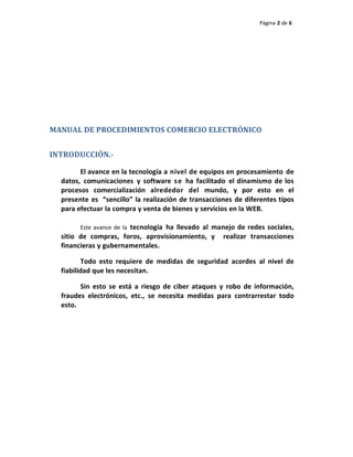 Este documento proporciona recomendaciones sobre procedimientos de seguridad para el comercio electrónico. Recomienda medidas como el uso de infraestructura segura con respaldo, cifrado avanzado como AES y PGP, y certificados digitales emitidos por autoridades de certificación reconocidas para autenticar transacciones de forma segura. El objetivo es establecer las mejores prácticas de seguridad para proteger la información transmitida electrónicamente.