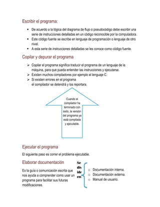 El documento describe los pasos para resolver problemas utilizando una computadora, incluyendo definir el problema, analizarlo, diseñar un algoritmo, codificar el programa, depurarlo, ejecutarlo y elaborar documentación. Explica cada paso como definir los datos de entrada y salida deseados, crear un algoritmo general y finito, y producir documentación interna, externa y un manual de usuario.