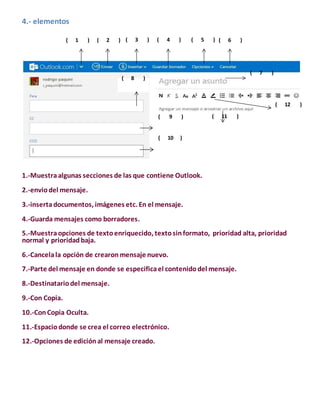 Este documento describe los elementos y funciones básicas de Outlook para el envío y recepción de correo electrónico. Explica las secciones principales de Outlook como la bandeja de entrada, borradores y enviados. También detalla los elementos para crear un nuevo mensaje como el destinatario, asunto y cuerpo del mensaje. Finalmente, muestra una imagen con las opciones comunes para gestionar el correo como crear, responder, eliminar y archivar mensajes.