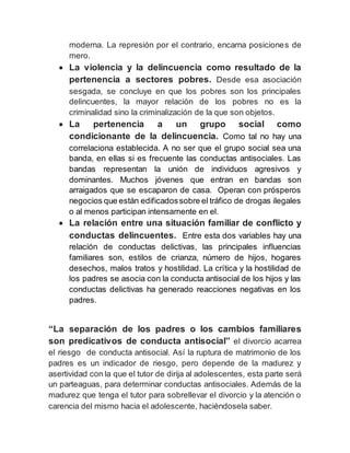 El documento discute la relación entre la violencia, el castigo y la criminalidad. Argumenta que el castigo no controla la violencia sino que la genera, y que la pobreza y la pertenencia a grupos sociales no son determinantes de la delincuencia. En cambio, factores familiares como los estilos de crianza, la hostilidad de los padres, y el divorcio pueden predecir conductas antisociales, especialmente en varones debido a factores culturales y hormonales. No es correcto afirmar que todos los adolescentes están en riesgo debido a la varied