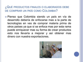 El documento presenta posibles soluciones para reducir la deuda externa de Colombia, como dejar de pedir más préstamos y en su lugar invertir en educación, tecnología y ciencia para desarrollar mejores productos de exportación que generen más ingresos. También propone dar más oportunidades laborales para aumentar la producción interna y externa, comprar la mejor materia prima y vender a mejor precio, solo pedir préstamos para salud y vivienda, e invertir en educación para que los ciudadanos elijan mejores gobern