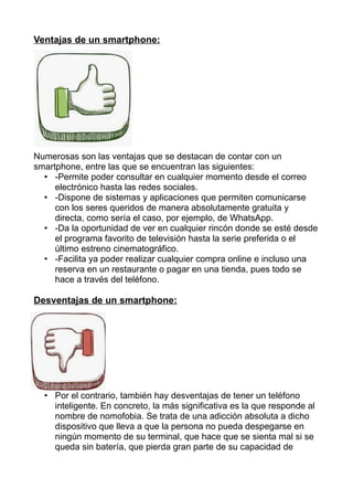 Los smartphones son teléfonos inteligentes que ofrecen funciones avanzadas como conexión a Internet, aplicaciones y pantallas táctiles, además de las básicas de un teléfono celular. Entre sus ventajas se destacan la conectividad, capacidad multimedia y organización de contactos e información. Los sistemas operativos más comunes son Android e iOS, y los fabricantes líderes incluyen Apple, Samsung y Huawei.
