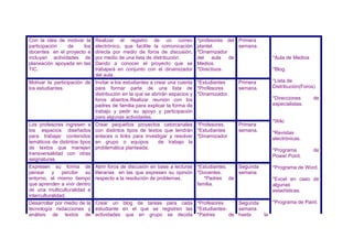 Este documento presenta un plan para promover el uso de las TIC en la enseñanza y el aprendizaje. El plan incluye registrar a los profesores y estudiantes en listas de distribución y foros de discusión en la primera semana para comunicarse y compartir contenidos. También incluye crear proyectos catorcenales en la primera semana para que los estudiantes investiguen y resuelvan problemas en grupos. En la segunda semana, se abrirán foros para debatir lecturas y expresar diferentes puntos de vista, y cada estudiante tendrá un blog para