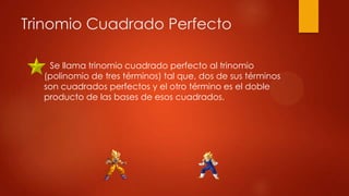 El documento describe el trinomio cuadrado perfecto (TCP), que es un polinomio de tres términos donde dos de los términos son cuadrados perfectos y el otro término es el doble producto de las bases de esos cuadrados. Explica que un TCP resulta de elevar un binomio al cuadrado y proporciona los pasos para resolver un TCP: 1) sacar la raíz cuadrada del primer término, 2) sacar la raíz cuadrada del tercer término, y 3) elevar la suma de las raí