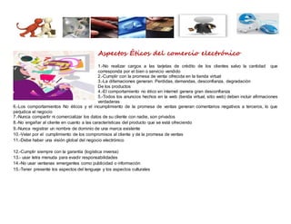 Este documento describe varios aspectos éticos que deben seguirse en el comercio electrónico, como no realizar cargos no autorizados a tarjetas de crédito, cumplir con las promesas de venta, incluir solo afirmaciones verdaderas en los anuncios, y proteger la privacidad de los datos de los clientes. También señala que los comportamientos no éticos pueden generar pérdidas, demandas, desconfianza y comentarios negativos que perjudican el negocio.