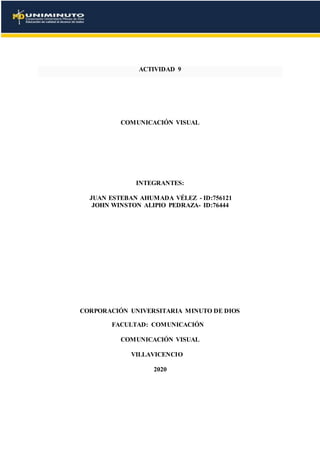 Este documento presenta una actividad sobre comunicación visual realizada por dos estudiantes de la Universidad Minuto de Dios. La actividad analiza el uso de herramientas web 2.0 a nivel gobierno, empresarial y académico, experiencias de otros países como Estados Unidos y Canadá, experiencias en Colombia en 2020, el potencial de la web 2.0 para empoderar a los ciudadanos y aumentar su participación, cómo las entidades públicas pueden interactuar en la web 2.0, cómo medir el impacto de estas herramientas, y los retos para el