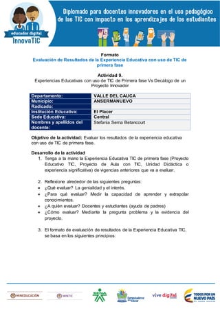 Este documento presenta un formato para evaluar los resultados de una experiencia educativa con uso de TIC implementada previamente. El formato incluye secciones para caracterizar la experiencia educativa, describir cómo se desarrollaron principios como las situaciones de aprendizaje, objetivos de aprendizaje y uso de herramientas TIC, y proveer una calificación para cada principio. El documento también presenta detalles de una experiencia educativa específica sobre soluciones plásticas para un mundo plástico que fue implementada con estudiantes de primaria.