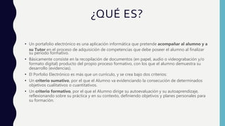 El portafolio electrónico es una herramienta que ayuda al alumno y tutor a rastrear el progreso del alumno en la adquisición de competencias. Consiste en una colección de evidencias en varios formatos que demuestran el desarrollo del alumno. Funciona mediante la estructuración de las competencias en actividades que el alumno completa, como adquirir conocimientos o realizar tareas cualitativas evaluadas por el tutor.