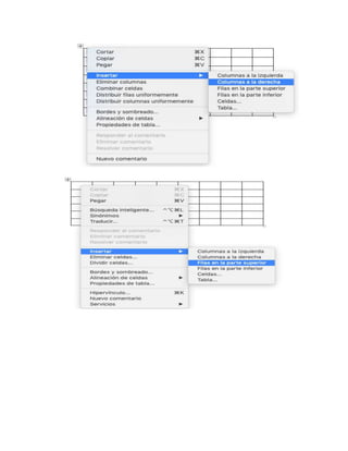 Este documento explica cómo eliminar, insertar y modificar celdas en una hoja de cálculo. Describe cómo eliminar filas o columnas completas haciendo clic derecho y seleccionando la opción correspondiente, así como cómo insertar nuevas filas o columnas eligiendo la posición. También cubre cómo combinar o dividir celdas seleccionadas y cómo insertar celdas individuales hacia la derecha, abajo o en filas o columnas completas.