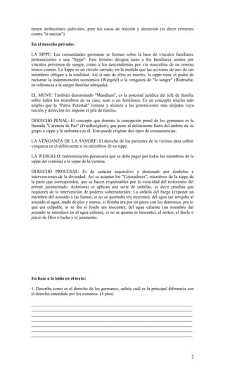 El documento describe las características de la sociedad germana previa a la invasión del Imperio Romano Occidental. Explica que el derecho germano se basaba en la costumbre y la reciprocidad más que en leyes escritas. También describe las instituciones de la sippe (comunidad familiar) y el munt (autoridad del jefe de familia), así como el derecho penal basado en la venganza de sangre y la wergelt (compensación económica). Finalmente, presenta preguntas sobre estos temas para ser respondidas por los estudiantes