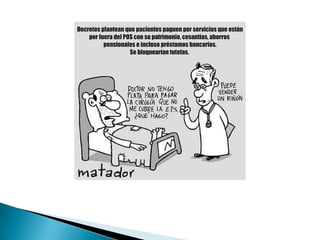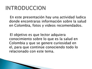 Este documento describe el sistema de salud en Colombia. Explica que está regulado por la Ley 100 de 1993 y comprende tres entes: el estado como coordinador, las aseguradoras que administran los recursos, y los prestadores que brindan los servicios directamente. También incluye videos y textos recomendados para conocer más sobre el tema, así como actividades para que el lector analice y resuma su conocimiento sobre la salud en Colombia.