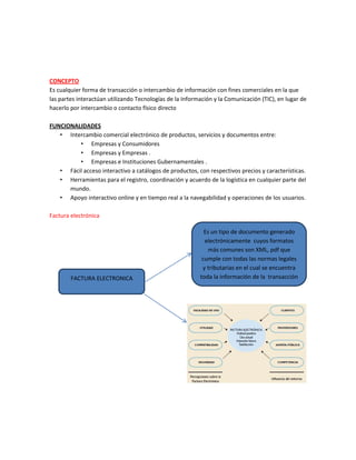 Este documento describe conceptos y tecnologías relacionadas con el comercio electrónico. Define el comercio electrónico como cualquier transacción comercial que involucra el intercambio de información a través de tecnologías de la información en lugar de contacto físico. Explica funcionalidades como el intercambio de productos, servicios y documentos entre empresas, consumidores e instituciones gubernamentales. Además, describe la factura electrónica, Google Wallet, tarjetas inteligentes y el timestamping como tecnologías que permiten y