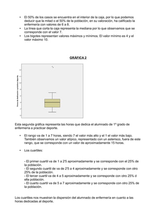Este documento resume cuatro gráficos de caja y bigotes que representan: 1) La valoración social de la enfermería por estudiantes, 2) Horas dedicadas al deporte, 3) Número de cigarrillos fumados diariamente, 4) Peso de estudiantes por sexo. Analiza las características de cada gráfico como rangos, cuartiles, valores atípicos y diferencias entre sexos. Concluye que el peso tiende a ser mayor en hombres que en mujeres.