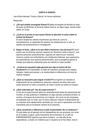 El documento resume la historia de Rowan, quien fue encargado de entregar una carta al General Calixto García en Cuba. Rowan completó su misión con éxito a pesar de los obstáculos, demostrando iniciativa, perseverancia y autosuficiencia. El autor usa esta historia para argumentar que estos son los valores que deberían enseñarse a los jóvenes y que diferencian a los líderes emprendedores de los mediocres.