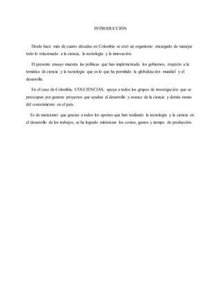Este documento resume las políticas públicas de ciencia, tecnología e innovación en Colombia. Explica que COLCIENCIAS ha apoyado proyectos de investigación durante más de 40 años para promover el desarrollo científico. Sin embargo, la inversión del gobierno en educación, ciencia y tecnología ha sido baja en comparación con otros países. Recomienda que Colombia debe enfocarse más en la educación, ciencia y tecnología para aprovechar mejor sus recursos naturales y lograr un mayor desarrollo económico y social.