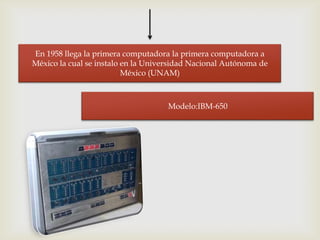 La llegada de las primeras computadoras a México en 1958 marcó el inicio de la adopción de la tecnología computacional en el país. A lo largo de las décadas siguientes, instituciones como la UNAM, PEMEX y el IPN fueron adquiriendo computadoras más avanzadas y creando programas de estudio en computación. En la década de 1980, México comenzó a integrar la tecnología de internet.
