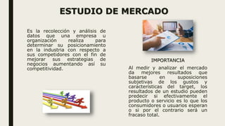 El documento aborda el estudio de mercado como una herramienta clave para mejorar la competitividad de las empresas mediante la recolección y análisis de datos sobre el posicionamiento en la industria. Se describen diferentes tipos de información y clasificaciones de productos, junto con conceptos de oferta, demanda y canales de distribución, todos fundamentales para la comercialización efectiva. También se destaca la importancia de la fijación de precios y el punto de equilibrio en la gestión empresarial.