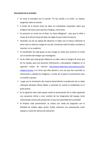 El documento describe una actividad de aprendizaje de 6 horas sobre los milagros de Jesús. Los estudiantes se dividirán en grupos para investigar un milagro específico, crear un video sobre el milagro usando imágenes de Internet y el software Windows Movie Maker, y presentar el video a la clase. El propósito es que los estudiantes conozcan y valoren los milagros de Jesús mientras desarrollan habilidades de producción y comprensión escrita usando herramientas tecnológicas.