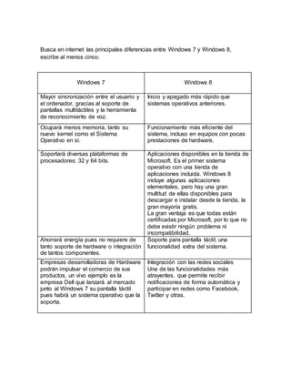 Las principales diferencias entre Windows 7 y Windows 8 incluyen que Windows 8 ofrece mayor sincronización entre el usuario y el ordenador gracias al soporte de pantallas táctiles y reconocimiento de voz, mientras que Windows 7 tiene aplicaciones disponibles pero Windows 8 incluye una tienda de aplicaciones. Otra diferencia es que Windows 8 ahorra más energía al requerir menos soporte de hardware.