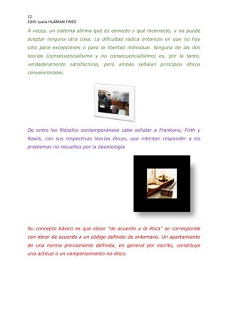 La deontología valora las conductas por su utilidad pero la humanidad necesita algún tipo de moral para regular sus comportamientos hacia los demás. Aunque Bentham inventó la palabra "deontología" para ser lo más amoral posible, terminó siendo un sinónimo de moralidad. Las teorías éticas intentan responder a los problemas no resueltos por la deontología al proponer que obrar de acuerdo a la ética significa seguir un código definido de antemano, apartarse del cual constituye un comportamiento no ético.
