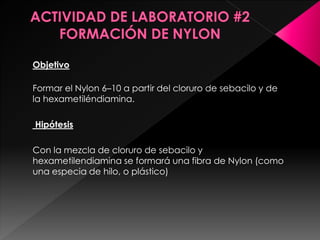 Este documento describe un experimento de laboratorio para formar Nylon 6-10 a partir de la reacción entre cloruro de sebacilo y hexametilendiamina. El procedimiento involucra agregar lentamente una solución de cloruro de sebacilo en hexano a una solución de hexametilendiamina en hidróxido de sodio, formando una fibra de Nylon en la interfase entre las dos soluciones inmiscibles. Los estudiantes observan que se forma un polímero blanco y transparente con textura suave y lisa. Concluyen que la hip