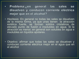 Las sales varían en su solubilidad y capacidad de conducir electricidad dependiendo si están en estado sólido o disueltas en agua o alcohol. Mientras que las sales sólidas no conducen electricidad, las disueltas en agua sí lo hacen debido a la presencia de iones móviles. El agua es un mejor disolvente que el alcohol porque su naturaleza polar permite que más sales se disuelvan y conduzcan corriente eléctrica.
