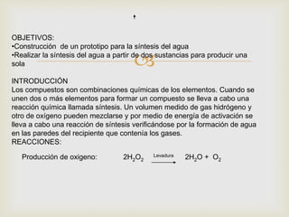 El documento describe un procedimiento para sintetizar agua a partir de hidrógeno y oxígeno. Los objetivos son construir un prototipo para esta síntesis y realizar la reacción usando dos sustancias. Se introducen los materiales necesarios como electrodos de níquel, agua oxigenada y levadura, y el procedimiento detalla cómo generar hidrógeno y oxígeno por separado y luego hacerlos reaccionar dentro de una botella para producir agua.