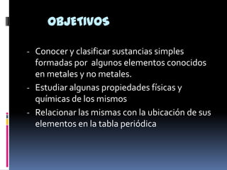 Este documento presenta una actividad de laboratorio para clasificar sustancias simples como metales y no metales. Los estudiantes observarán y describirán las propiedades físicas de elementos como el cobre, plata, plomo, hierro, aluminio, magnesio, fósforo, zinc, mercurio, potasio, carbono y azufre. Luego, usarán esta información para ubicar los elementos en la tabla periódica y clasificarlos como metálicos o no metálicos.