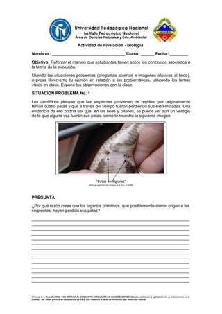 Este documento presenta cuatro situaciones problemas relacionadas con conceptos de la teoría de la evolución para que los estudiantes expresen sus opiniones y observaciones usando los temas vistos en clase. Las situaciones tratan sobre la evolución de las serpientes a partir de reptiles con patas, la selección natural en una población de mariquitas, las similitudes entre homínidos fósiles y humanos, y la relación evolutiva entre dinosaurios y aves.