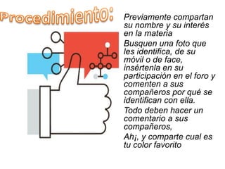Los estudiantes deben presentarse en un foro compartiendo su nombre, interés en la materia y una foto que los identifique de su teléfono móvil o Facebook. También deben comentar por qué se identifican con la foto elegida e interactuar con sus compañeros dejando un comentario a cada uno de ellos, además de compartir su color favorito.