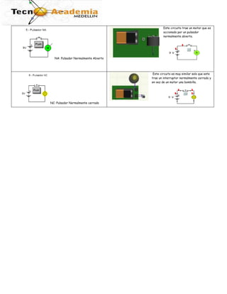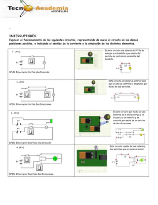 Este documento presenta varios circuitos eléctricos que incluyen interruptores, diodos, potenciómetros, termistores y relés. Explica el funcionamiento de cada circuito y cómo los diferentes elementos afectan el flujo de corriente eléctrica. También pide que se representen visualmente algunos circuitos y se analice cómo cambiarían si se modifican los valores de las resistencias u otros componentes.