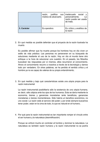 La razón ilustrada buscaba formar personas saludables y correctas para construir una sociedad armoniosa mediante el uso de la razón, mientras que la razón instrumental utiliza la razón como un instrumento para dominar a los hombres y la naturaleza con el fin de generar ganancias económicas sin considerar el bienestar social o personal. Aunque la razón ilustrada promovía el desarrollo de la naturaleza, la razón instrumental busca erradicarla para producir bienes.