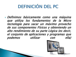La computadora se define como una máquina que utiliza la microtecnología para aprovechar al máximo sus componentes físicos y obtener un alto rendimiento de su parte lógica. Algunas de las utilidades más sencillas de una computadora incluyen la comunicación en tiempo real, hacer trabajos, hacer cartas y jugar.