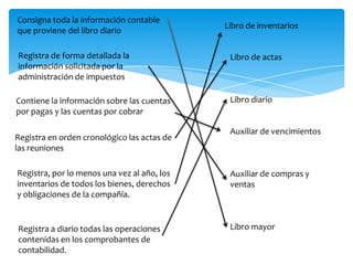 Este documento lista los diferentes libros y registros contables que una empresa debe mantener, incluyendo el libro de inventarios, libro de actas, libro diario, auxiliar de vencimientos, auxiliar de compras y ventas y libro mayor. Estos registros contienen información sobre cuentas por pagar y cobrar, inventarios anuales, operaciones diarias y actas de reuniones.
