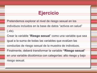 El documento describe los pasos para crear una variable de riesgo sexual y transformarla en una variable dicotómica en la base de datos "activos en salud" usando R-Commander. Primero se importan los datos de Excel y se crea la variable de riesgo sexual como la suma de variables de conducta de riesgo. Luego, esta variable se transforma en una variable dicotómica con categorías de alto y bajo riesgo sexual. Al final, las nuevas variables pueden verse en la base de datos.