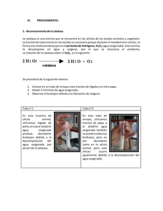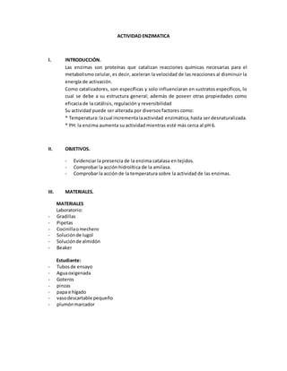Este documento describe la actividad enzimática y cómo se ve afectada por factores como la temperatura y el pH. Explica que las enzimas son proteínas que catalizan reacciones químicas y que su actividad puede ser alterada por la temperatura y el pH. A continuación, detalla tres experimentos para evidenciar la presencia de catalasa en tejidos, comprobar la acción de la amilasa e investigar el efecto de la temperatura en la actividad enzimática.