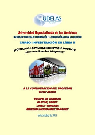 El documento describe una actividad realizada por un equipo para estudiar el uso de fotografías en la enseñanza de literatura y lingüística. El equipo analizó fotografías de periódicos locales para debatir lo que comunican y cómo pueden usarse en el aula para diferentes propósitos como motivar la escritura y el debate. El equipo concluyó que las fotografías son una poderosa herramienta pedagógica que desarrolla habilidades cognitivas y permite nuevas formas de enseñar y aprender.