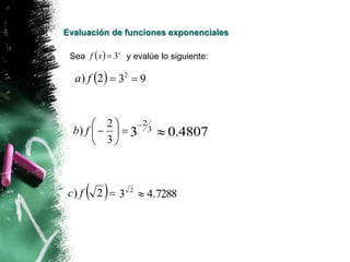 El documento presenta varios ejemplos y problemas relacionados con funciones exponenciales y el cálculo de interés compuesto. Incluye ejemplos de evaluación de funciones exponenciales, gráficas de funciones, un modelo exponencial para la diseminación de virus, y cálculos de interés compuesto de forma anual, semestral, trimestral, mensual, diaria y continua.