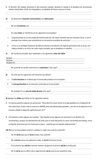 Este documento presenta una actividad evaluativa sobre prácticas del lenguaje que incluye completar enunciados sobre mitos de origen, génesis y teogonía, responder preguntas sobre elementos del libro como los paratextos y la biografía del autor, identificar elementos del circuito de la comunicación en situaciones dadas, definir conceptos como competencia lingüística, y analizar actos de habla y de discurso.