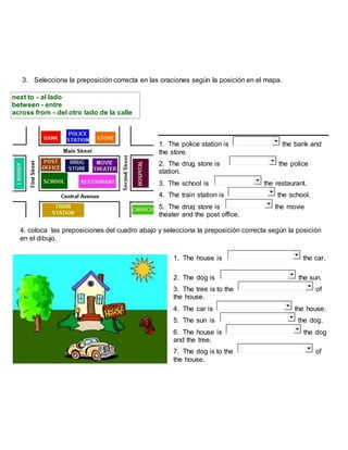 Este documento presenta una actividad evaluativa en inglés para el grado séptimo. Los estudiantes deben usar preposiciones de lugar en inglés para describir dónde están objetos en un dibujo. También deben seleccionar la preposición correcta en oraciones según la posición en un mapa o dibujo. El objetivo es que practiquen el uso de preposiciones de lugar como "next to", "between", "across from".