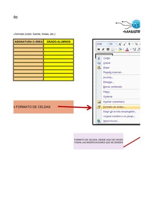 Este documento presenta una tabla con datos de estudiantes como nombres, institución educativa, correo electrónico, asignatura y grado. Instruye al lector sobre cómo cambiar el formato de la tabla y realizar cálculos matemáticos usando fórmulas de Excel.