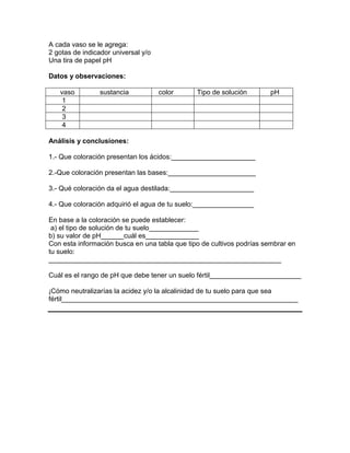 El documento describe un experimento para determinar la acidez del suelo mediante la medición de su pH. Los estudiantes medirán el pH de muestras de suelo usando papel indicador de pH e indicador universal y compararán los resultados con soluciones de ácido clorhídrico, hidróxido de sodio y agua destilada para determinar si el suelo es ácido, alcalino o neutro. Esto les permitirá predecir qué tipos de cultivos serían adecuados para ese suelo.