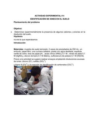 La actividad experimental tenía el objetivo de determinar la presencia de cationes y aniones en una muestra de suelo a través de pruebas químicas. Se utilizarían reactivos como ácido nítrico, nitrato de plata, cloruro de bario y sulfocianuro de potasio en la muestra de suelo tamizada para identificar iones como cloruro, sulfato y hierro. Los resultados ayudarían a determinar los componentes químicos presentes en el suelo.