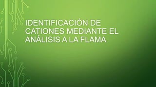 Este documento presenta un procedimiento para identificar cationes metálicos en muestras de suelo mediante el análisis a la flama. Los objetivos son identificar iones metálicos por el color que producen sus sales al quemarse en la flama de un mechero, y señalar los cationes presentes en las muestras de suelo. Se espera que cada catión presente en el suelo se pueda identificar por el color diferente que produzca la flama. El procedimiento implica quemar muestras de sales en la flama y anotar los
