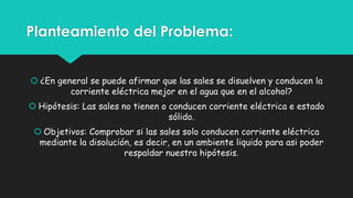 Este documento presenta un experimento sobre la solubilidad y conductividad eléctrica de sales en agua y alcohol. El experimento busca comprobar si las sales solo conducen electricidad en solución acuosa, respaldando la hipótesis de que las sales no conducen en estado sólido. Se midió la solubilidad y conductividad de varias sales como NaCl, KI, CuCl2 y otras en agua y alcohol, encontrando que todas conducen en agua pero solo algunas lo hacen débilmente en alcohol. La conclusión fue que la hipótesis se confirm