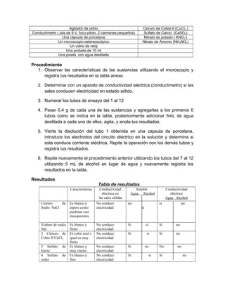 Este documento describe un experimento para comparar la solubilidad y conductividad eléctrica de varias sales en agua y alcohol. Se probaron sales como cloruro de sodio, yoduro de potasio y cloruro de cobre usando agua y alcohol como disolventes. Los resultados mostraron que las sales tienden a ser más solubles y mejores conductoras eléctricas en agua que en alcohol.