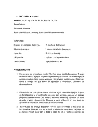 Este documento describe un experimento para determinar la reactividad de varios metales (Na, K, Mg, Ca, Sr, Al, Sn, Pb, Fe, Cu, Zn) con agua y ácido clorhídrico. Se colocaron muestras de cada metal en tubos de ensayo con agua y ácido para observar la velocidad y naturaleza de sus reacciones. Los resultados mostraron que el potasio y el sodio fueron los más reactivos, reaccionando en menos de 1 segundo, mientras que el plomo y el cobre