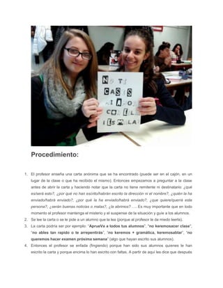 La actividad de expresión escrita a través de cartas anónimas promueve la motivación y comunicación en estudiantes de 6 a 16 años. Los objetivos incluyen la escritura y lectura de cartas anónimas, exploración de diversos géneros y situaciones, y fomentar destrezas lingüísticas en un ambiente de suspenso. Se utilizan diversos materiales y procedimientos para guiar a los alumnos en la creación y discusión de sus cartas, culminando con actividades interactivas y votaciones sobre las mejores cartas.