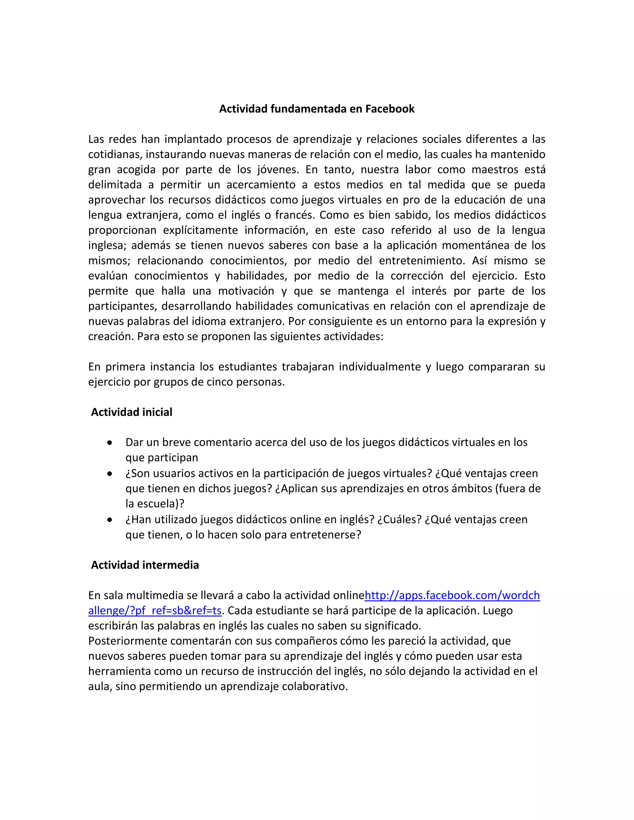 Este documento propone el uso de juegos virtuales como Word Challenge en Facebook para enseñar vocabulario en inglés. Los estudiantes primero trabajarán individualmente en Word Challenge y luego compararán sus resultados en grupos. Luego discutirán cómo esta herramienta puede usarse como un recurso colaborativo para el aprendizaje del inglés fuera del aula. El objetivo es motivar a los estudiantes y ayudarlos a desarrollar habilidades comunicativas en inglés de manera entretenida.