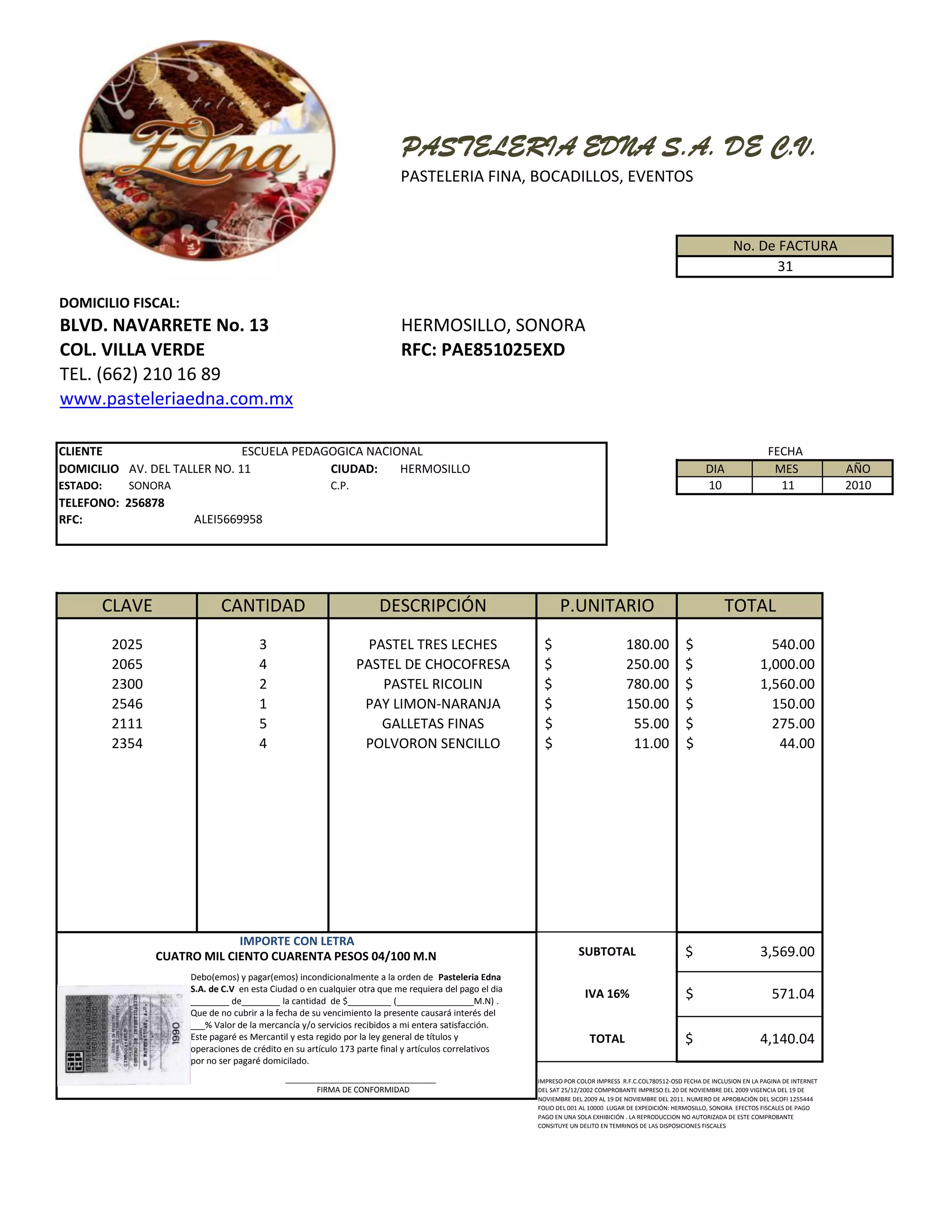 Este documento es una factura emitida por Pastelería Edna S.A. de C.V. a la Escuela Pedagógica Nacional por $4,140.04 pesos por la venta de pasteles, galletas, polvorones y otros productos. La factura detalla 6 productos vendidos con su clave, cantidad, descripción, precio unitario y total. Al final se especifica el subtotal, IVA y total a pagar.